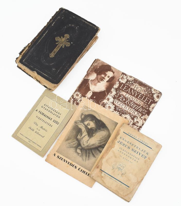 5 db régi vallási témájú kiadvány, imakönyv: Ájtatossági gyakorlatok a Fájdalmas Szűz tiszteletére.; Erdey Ferenc: Engeszteljük Jézus szívét.; A szenvedés éjjele.; P. Csávossy Elemér: Egy leányélet elindul a Jó Istenhez vezető úton.; Kirchengesänge für katholische Christen [...] (Német nyelvű katolikus énekeskönyv, 1886.) Változó állapotban, sérülésekkel.