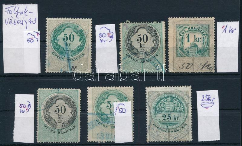 Leírás: 6 db okmánybélyeg foltokkal, vésésjavítással / fiscal stamps with paint spots, retouche