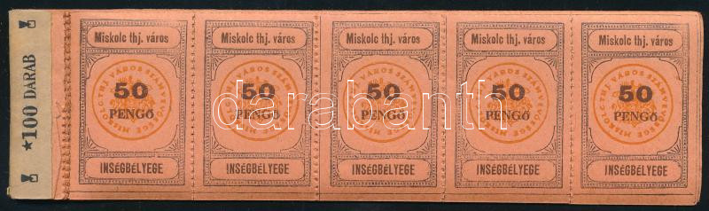 Leírás: Miskolc városi ínségbélyeg 50P füzet, benne 28 db bélyeg