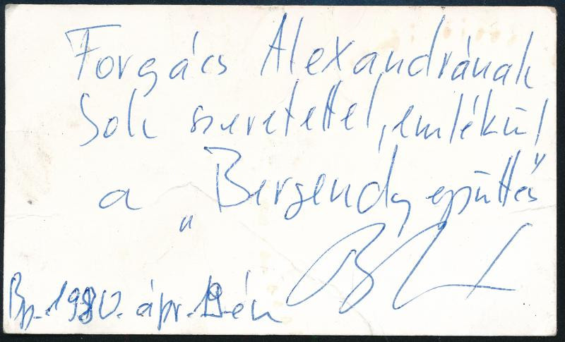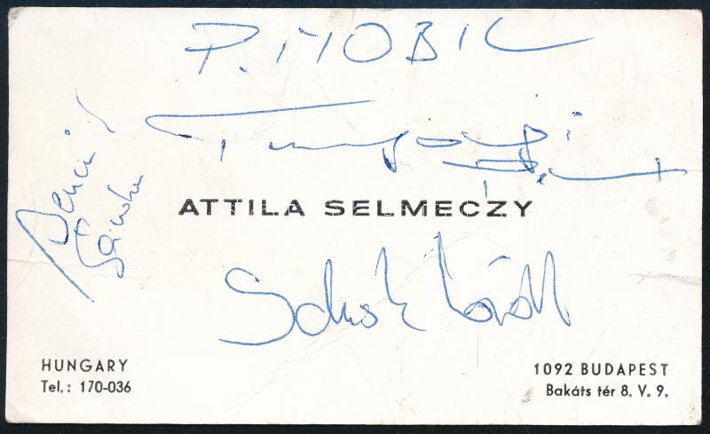 A P. Mobil rockegyüttes tagjainak aláírásai névjegykártyán: Tunyogi Péter, Bencsik Sándor, Schuster Lóránt + a másik oldalon Bergendy István, a Bergendy-együttes alapítójának dedikációja