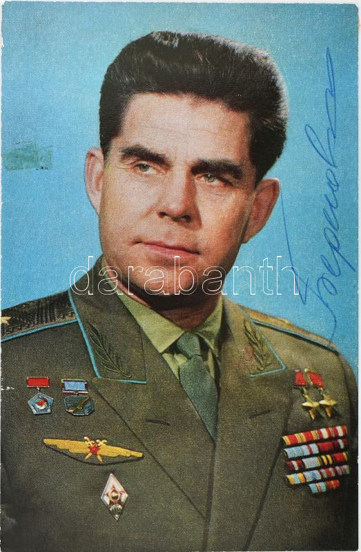 Georgij Tyimofejevics Beregovoj (1921-1995) szovjet űrhajós autográf aláírása őt ábrázoló képeslapon / Autograph signature of Georgy Timofeyevich Beregovoy (1921-1995) Soviet cosmonaut on a postcard