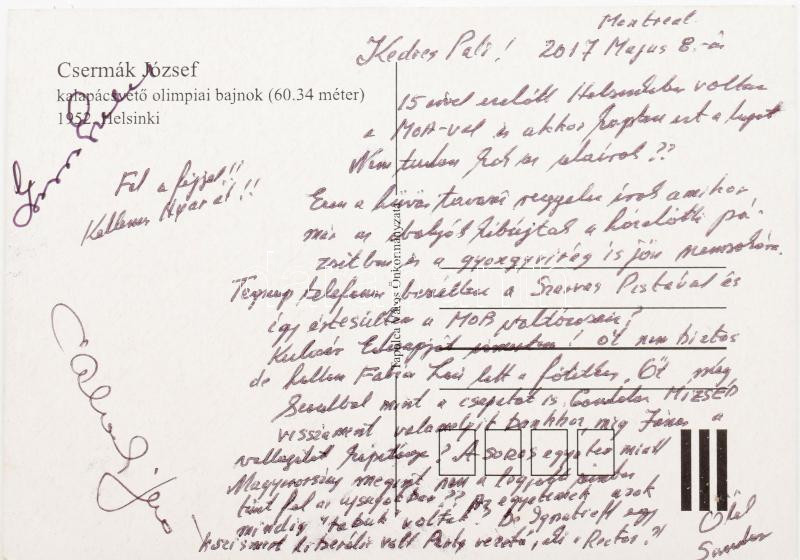 Leírás: Grosics Gyula (1926-2014) labdarúgó, az Aranycsapat tagjának aláírása egy képeslapon más aláírásokkal és felirattal
