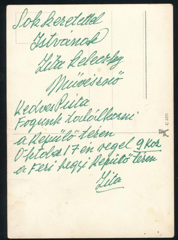 Leírás: Szeleczky Zita (1915-1999) színésznő dedikált, fiatalkori fényképe. Mérete: 10x15 cm