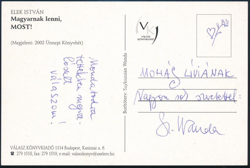 Leírás: Szyksznian Wanda (1948-) grafikus, plakátművész autográf sorai, és aláírása, képeslapon, Mohás Lívia (1928-2024) pszichológus, József Attila-díjas író részére.