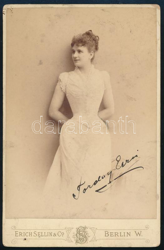 cca 1890 Torday Grail Erzsi (1862-1945) tanítónő, szavalóművész sajátkezű aláírása portréján, keményhátú fotó Erich Sellin & Co berlini műterméből, kissé kopott, 17x11 cm