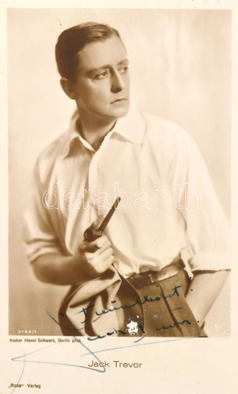 Leírás: cca 1930 Jack Trevor (1893-1976) brit filmszínész autográf deikációja őt magát ábrázoló képeslapon, apró kopással / autograph dedication on postcard