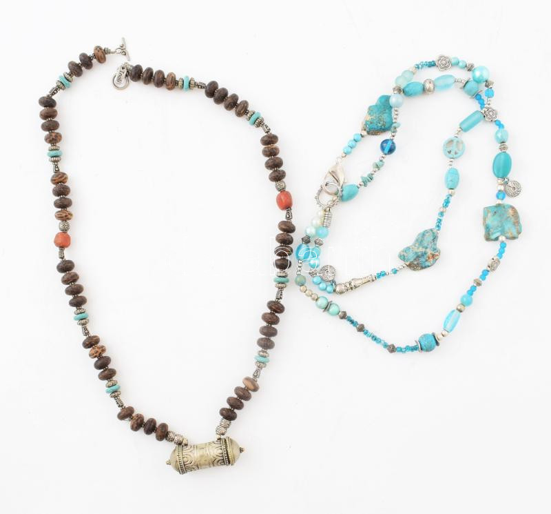 Leírás: 2 db dekoratív tribal stilusú nyaklánc, fa gyöngyökkel, kövekkel, stb 90 cm, 70 cm