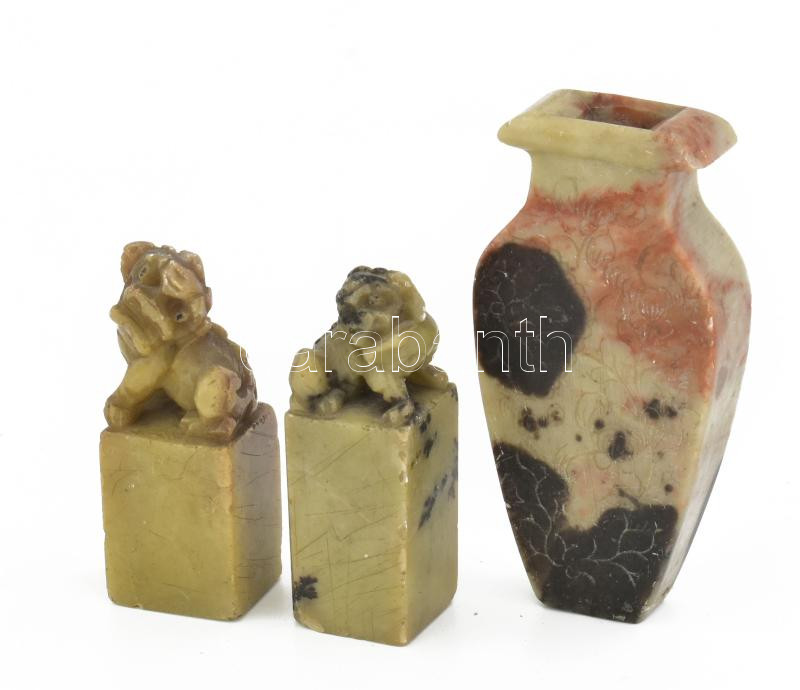Leírás: 3 darab zsírkő tárgy, fo kutyás pecsétnyomók 6,5 cm kisebb sérülésekkel, váza 9 cm