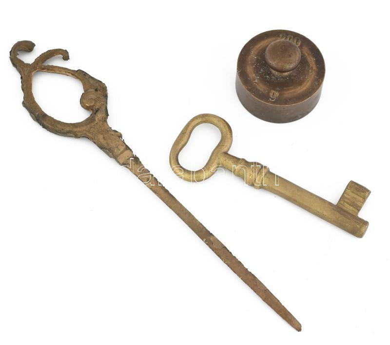 Leírás: 3 db réztárgy: kulcs, 200 g-os súly, levélbontó