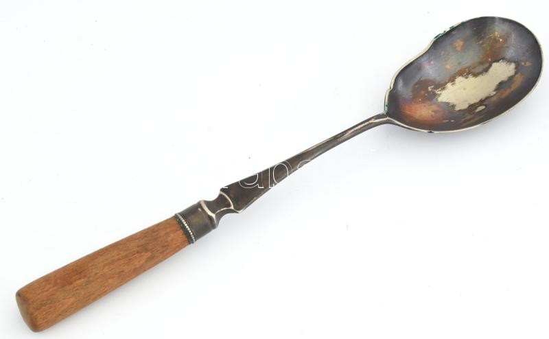 Antik ezüstözött szervírozókanál, fa nyéllel, jelzett, kopott, h: 27 c... https://www.darabanth.com/hu/471-Gyorsarveres/471.0/Mutargy-papirregiseg-egyeb/Bolhapiac~500014/Antik-ezustozott-szervirozokanal-fa-nyellel-jelzett-kopott-h-27-cm~II3192715