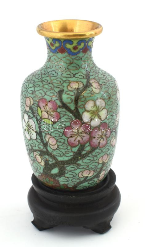 Leírás: Antik tűzzománc váza, kis fa talpon, teljes m: 10 cm