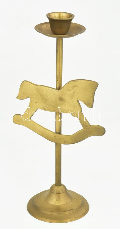 Leírás: Lófigurával díszített réz gyertyatartó, kopással, m: 23,5 cm
