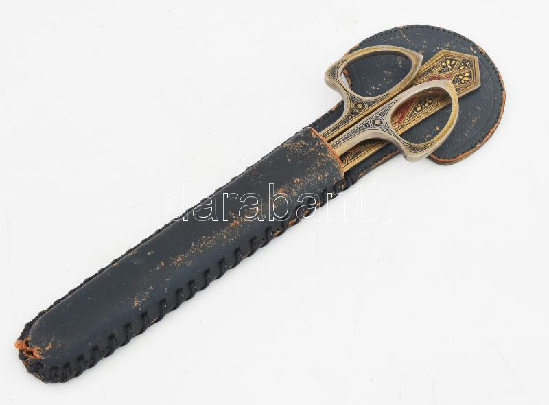 Leírás: Solingeni ollo és levélnyitó kissé sérült bőr tokkal 25 cm