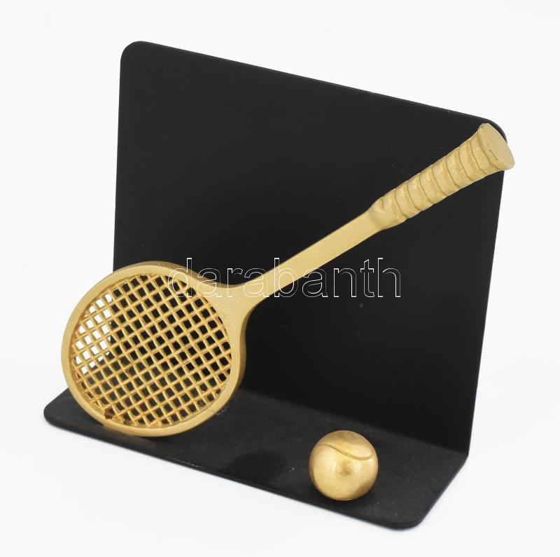 Leírás: Teniszütő és labda elemekkel díszített névjegykártyatartó, fém, 12x11 cm