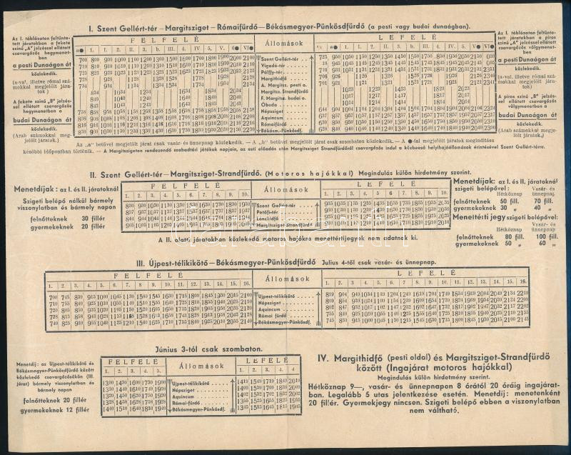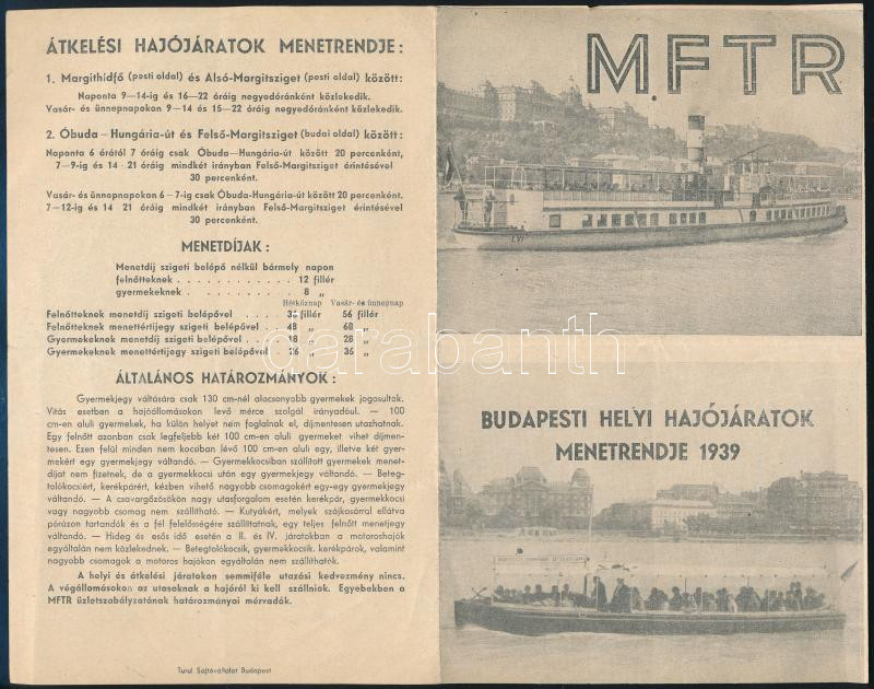 Leírás: 1939 MFTR (Magyar Folyam- és Tengerhajózási Részvénytársaság), budapesti helyi hajójáratok menetrendje. Bp., Turul Sajtóvállalat-ny., 2 sztl. lev.