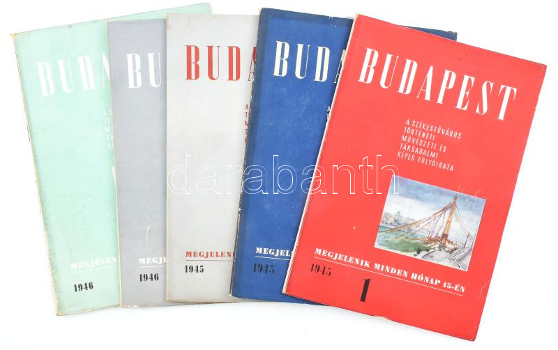 1945 Budapest, a székesfőváros történeti, művészeti és társadalmi képes folyóirata, I. évfolyam 1. számtól 1,2,3,6,7 számok, a borítólapot tervezte: Kozma Lajos