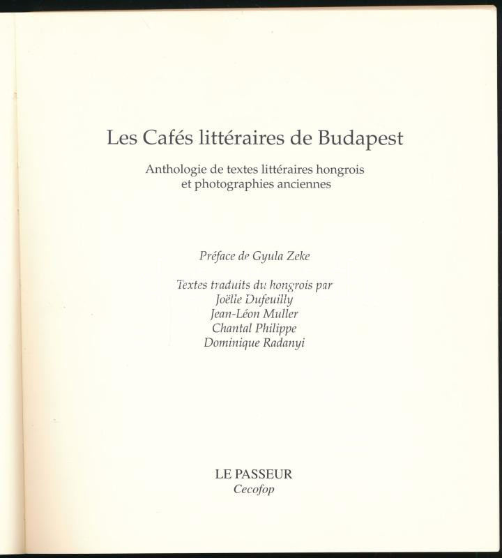 Jenő Heltai, Dezső Kosztolányi, Frigyes Karinthy et alli: Les Cafés littéraires de Budapest. Anthologie de textes littéraires hongrois et photographies anciennes. Nantes, 1998, Éditions Le Passeur-Cecofop. Francia nyelven. Kiadói papírkötés, borítón apró kopásnyomokkal.