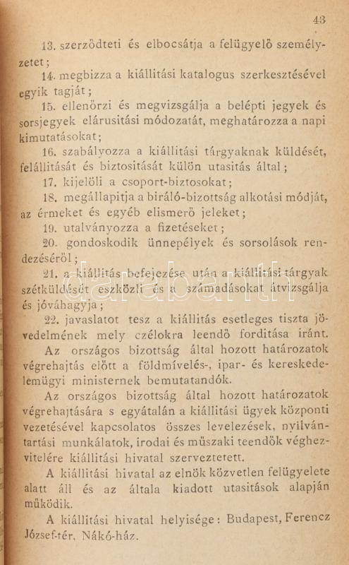 Kiállítási Útmutató az 1885. évi Budapesti Országos Általános Kiállítás bizottsági tagjainak, a kiállítóknak s a kiállítás iránt érdeklődőknek. Hivatalos adatok alapján szerkesztették Balogh Vilmos és Toldy Ferencz. Bp. 1883., Pesti Könyvnyomda Rt., IX+311+9 p.+16 sztl. lev. Az 1885. évi kiállítás volt az első, amit a Városligetben rendeztek, erre épült az Iparcsarnok is. 270.000 négyzetméteren mintegy 600 kiállító jelent meg. Itt mutatták be a Ganz-féle kéregöntésű vasúti kereket vagy a Thonet bútorokat is. Kiadói egészvászon-kötés, kopott, foltos borítóval, az elülső tábláról a papírborítás levált, a hátsó táblán a papírborítás sérült, javított.