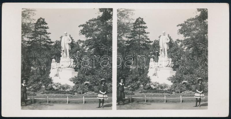 Leírás: cca 1900 Budapest, Erzsébet tér Semmelweis Ignác szobra sztereofotó 18x9 cm