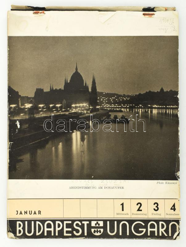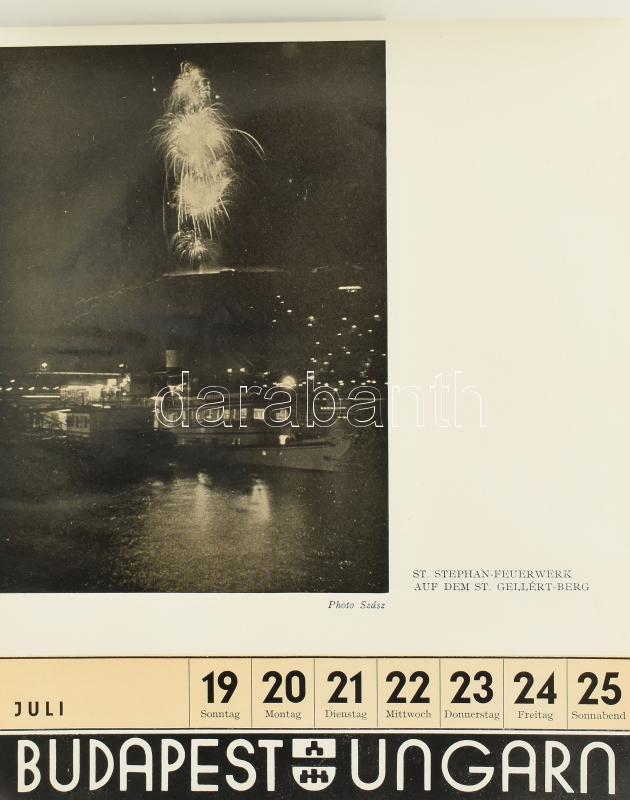 cca 1935 Budapest-Ungarn, német nyelvű, fekete-fehér fotókkal illusztrált naptár. Bp., Székesfővárosi Házinyomda. Kissé viseltes, sérült állapotban, 25x18,5 cm