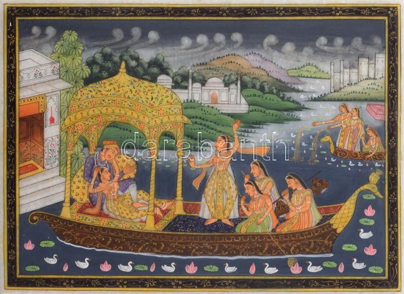 Leírás: Indiai festett kép alabástrom / márvány lapon, 13x17 cm