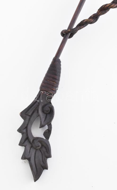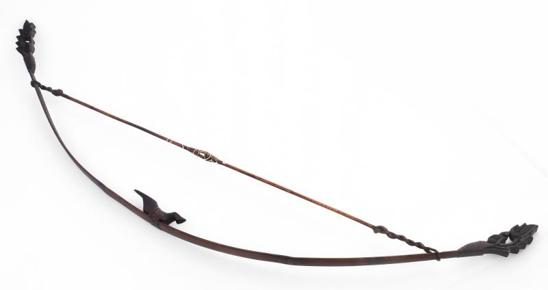 Leírás: Tradicionális íj. Faragott díszítéssel, fáján némi repedéssel, de összességében jó állapotban, h: 120 cm