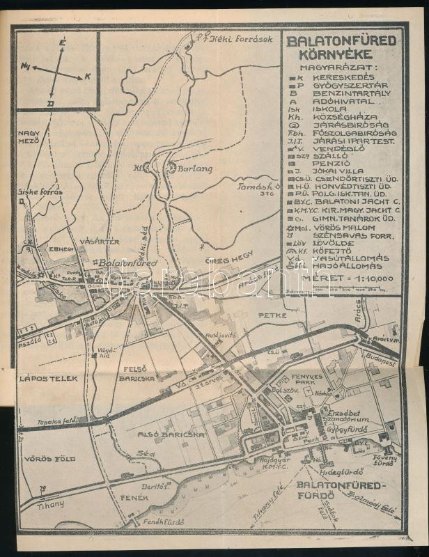 Iván József: Balatonfüred környéke és a Balaton. Szerk.: - -. Balatonfüred, 1935, Iglói János, 144 p. + 3 (kihajtható térképek) t. Fekete-fehér szövegközti fotókkal illusztrált. Kiadói papÃrkötés, foltos borÃtóval, a borÃtón késÅ‘bbi műanyag védÅ‘fóliával.