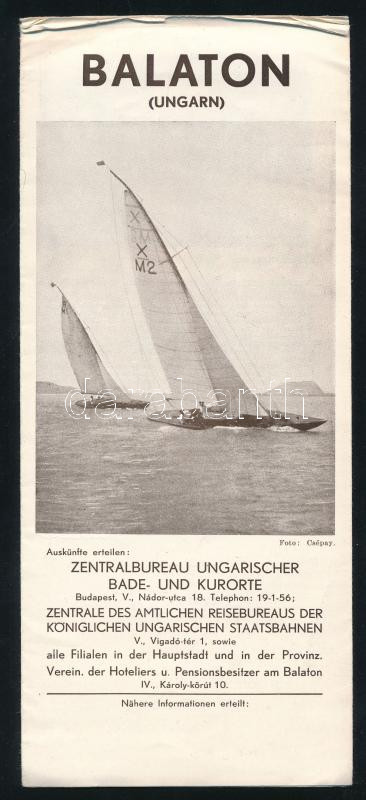 cca 1930-35 Fekete-fehér képekkel illusztrált, kihajtható turisztikai Balaton prospektus, számos érdekes korabeli információval (közlekedés, fürdőhelyek listája, panziók árai, hotelek listája stb.), német nyelven, apró szakadásokkal, jó állapotban