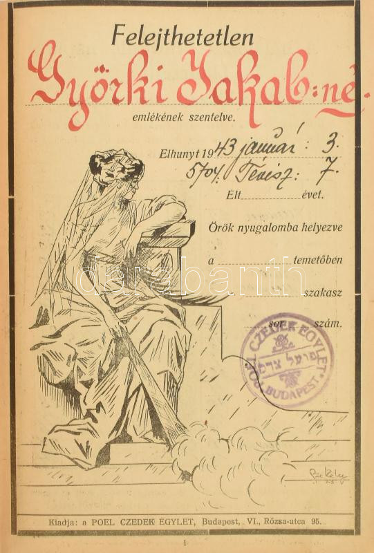 Leírás: 1943 ,,Emlékezésem, gyászom", izraelita halálozási emlékkönyv, kalendárium. Kiadja: a Poel Czedek Egylet, Bp. (Neuwald Illés Utódai-ny.), 22 p. Aranyozott félvászon-kötésben, kitöltve, a Poel Czedek Egylet bélyegzőjével.