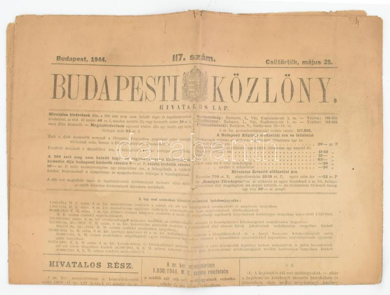 A Magyar Közlöny 1944, májsu 25.-i száma, benne zsidók zár alá vett mű... https://www.darabanth.com/hu/471-Gyorsarveres/471.0/Mutargy-papirregiseg-egyeb/Judaika~1000004/A-Magyar-Kozlony-1944-majsu-25-i-szama-benne-zsidok-zar-ala-vett-mutargyainak-szambavC3~II3171232