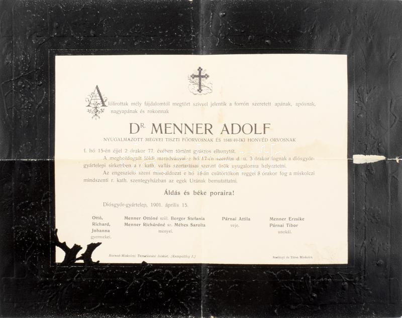 Leírás: 1901 dr. Menner Adolf 1848-49-es honvéd orvos halálozási értesítője sérüléssel