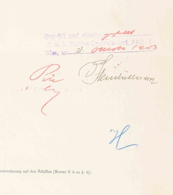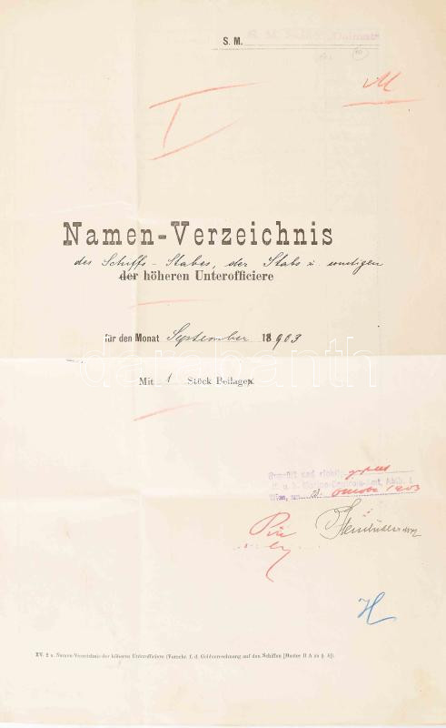 1903 Az S.M.S. Dalmat kimutatása az 1903 szeptemberében fedélzetre lépett személyekről. A parancsnok aláírásával és a hajó pecsétjével, alul részletezve a személyek / Namenverzeichnis der höheren Unterofficiere, amended to include officers. The form was preprinted with the date 18__, which was changed by hand to 1903. It is for the month of September 1903. 1909. Four-page document signed in Zara on September, 1909, by the officer in command, Linienschiffleutnant Eduard Höchsmann (gazetted Fregattenkapitän on November 1, 1907; not found in the 1917 Rangliste); and by the Gesamtdetailoffizier Seefähnrich Felix Neuffer (gazetted Linienschiffsleutnant on May 1. 1905, not found in the 1917 Rangliste).