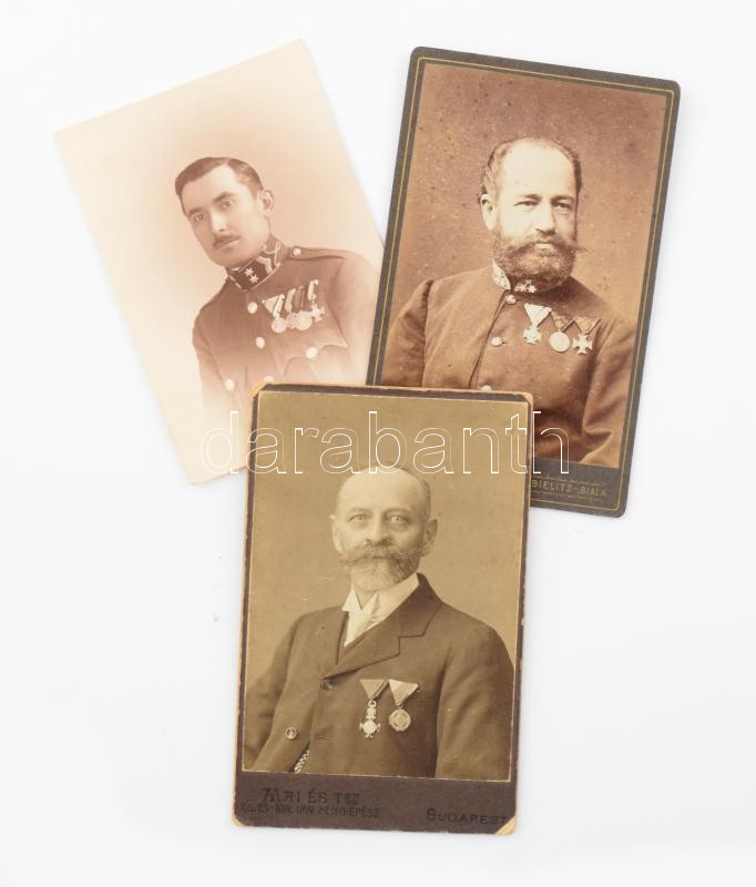 Leírás: 1910-1930 3 katonatiszt kitüntetésekkel vizitkártya fotók