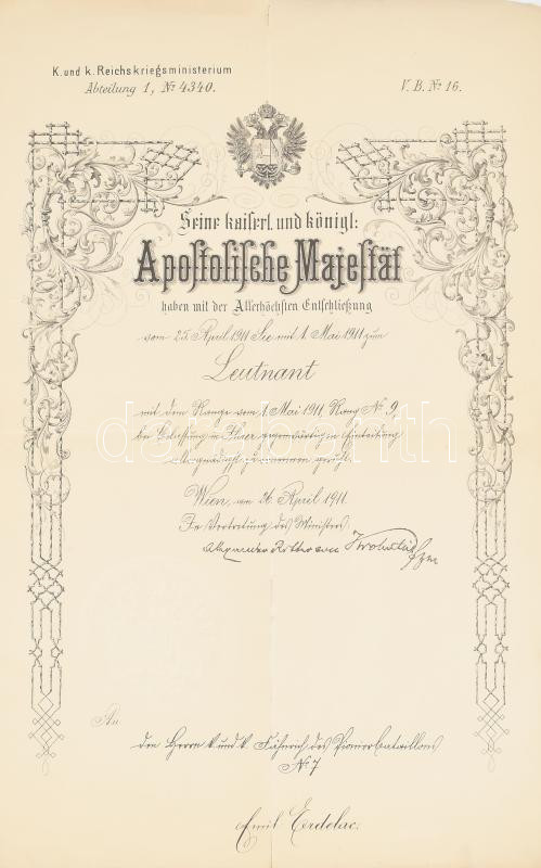 1911 K. und k. hadnagyi kinevezés, fejléces papíron, szárazbélyegzővel, Alexander von Krobatin (1849-1933) hadügyminiszter sokszorosított aláírásával, lapszéli szakadásokkal