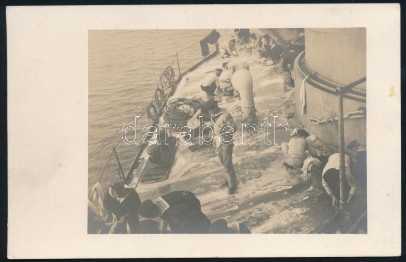 1915 Az S.M.S. Babenberg osztrák-magyar hadihajó matrózai tisztítják a hajót szénrakodás után. Fotólap / Black-and-white photo postcard Buckets, brushes, and rags in hand, sailors engage in the back-breaking chore of making S.M.S. Babenberg ship-shape after loading coal.