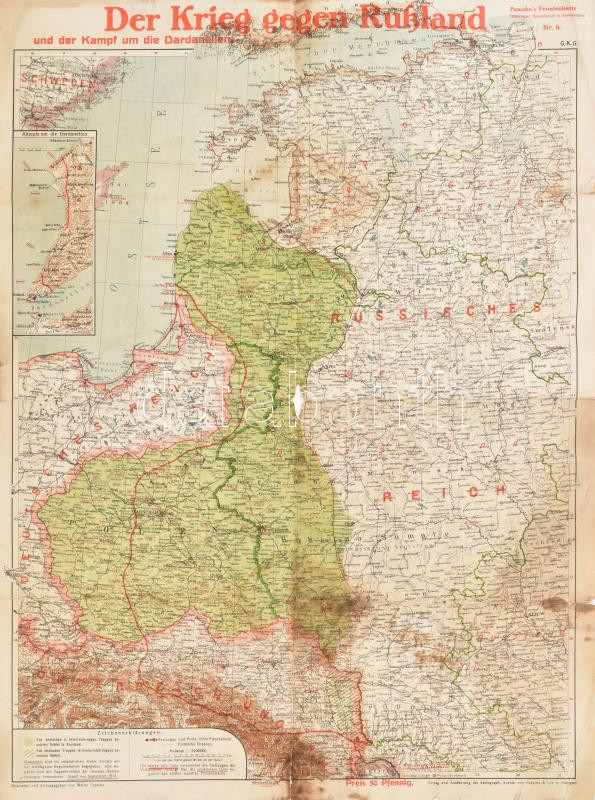 1915 Der Krieg gegen Rußland und der Kampf um die Dardanellen /Der westliche Kriegsschauplatz, Paasche's Frontenkarte, hajtott, szakadt, sérült, középen hiánnyal, 60x44 cm