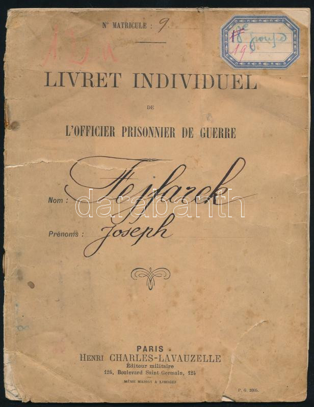 1918-19 vitéz Fejes (Fejfarek) József (1890-1972), a 69. gyalogezred főhadnagyának, későbbi miniszter-helyettesnek a francia hadsereg által vezetett I. világháborús hadifogoly könyvecskéje, számos francia nyelvű bejegyzéssel, kissé foltos és sérült borítóval, kijáró és tűzés mentén kissé foltos lapokkal