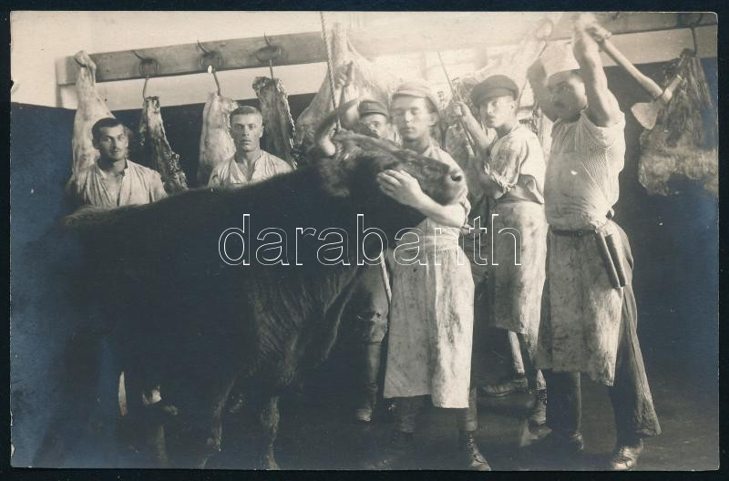 1919 Stobbe Kálmán (1883-1936) építőmester, díszlettervező, labdarúgó, a magyar válogatott edzője pecséttel jelzett fotója, a Krasznaja Recska, Rjecska, Krasnaia- Rjetschka (Vladivostok) hadifogoly tárborban. Vágóhíd. feliratozott / Slaughterhouse in the Krasnaia- Rjetschka (Vladivostok) Japanese-Russian POW (prisoner of war) camp. photo 15x10 cm