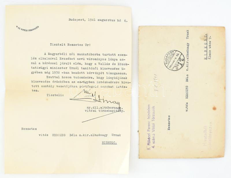 Leírás: 1938 A II. Rákóczi Ferenc fejedelem 4. számú Vitézi Törzsszék székkapitányának levele pecséttel magyarbéli női munkatáborbeli hölgy ügyében
