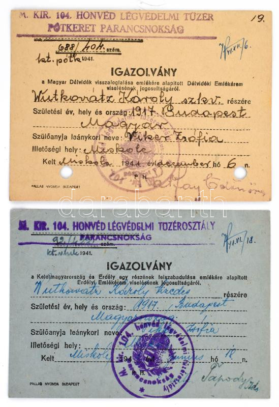 Leírás: 1941 2db kitüntetés viselési igazolvány, az Erdélyi Emlékérem és a Délvidéki Emlékérem kitüntetések viselésére.
