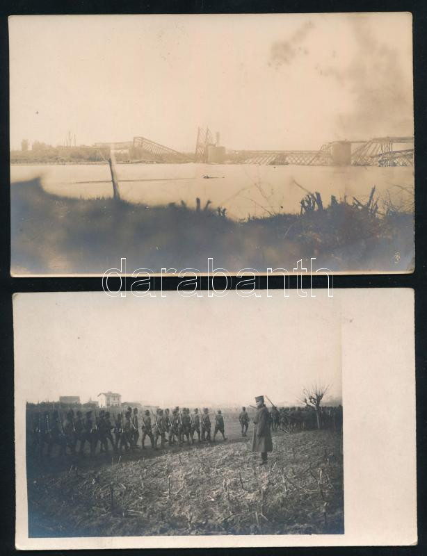 Leírás: 2 db I. világháborús fotólap: menetelő katonák, felrobbantott vasúti híd, 14x9 cm körül