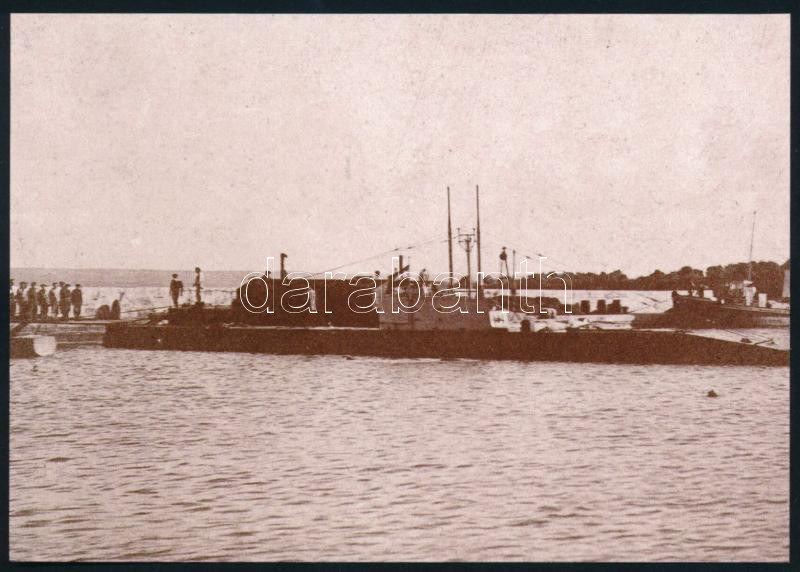 Az osztrák-magyar haditengerészet S.M. U-I. tengeralattjárója, modern nagyítás, 14x9 cm / S.M. U-I docked in Pola. The crew is lined up on the pier and the submarine is flying the k.u.k. Kriegsmarine flag. modern copy