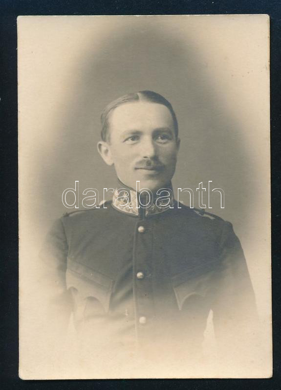 cca 1914-1918 Katonatiszt / tiszthelyettes portréja, az egyenruha gallérján Szent Koronával(?), a hátoldalon pecséttel jelzett fotó (Szente Géza, Sárvár), 8,5x6 cm
