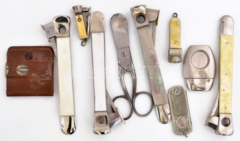 Leírás: 10 db vegyes méretű régi szivarvágó, benne fém, csont, gyöngyház, agancs nyelűekkel 20 cm-ig