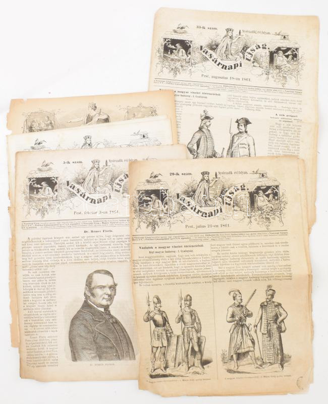 1856-1861, 1879. A Vasárnapi Újság 5 db száma (1856 33. sz., 1856. aug. 17, 1861 VIII. évf. 5., 29.,33. sz., 1861. feb. 3., jul. 21., aug. 18., 1879 XXVI. évf. 5. sz., 1879. feb. 2.) Fametszetű illusztrációkkal, hírlapbélyegekkel, mindegyik szám hiányos, az 1879-es szám címlapja leszakadt.