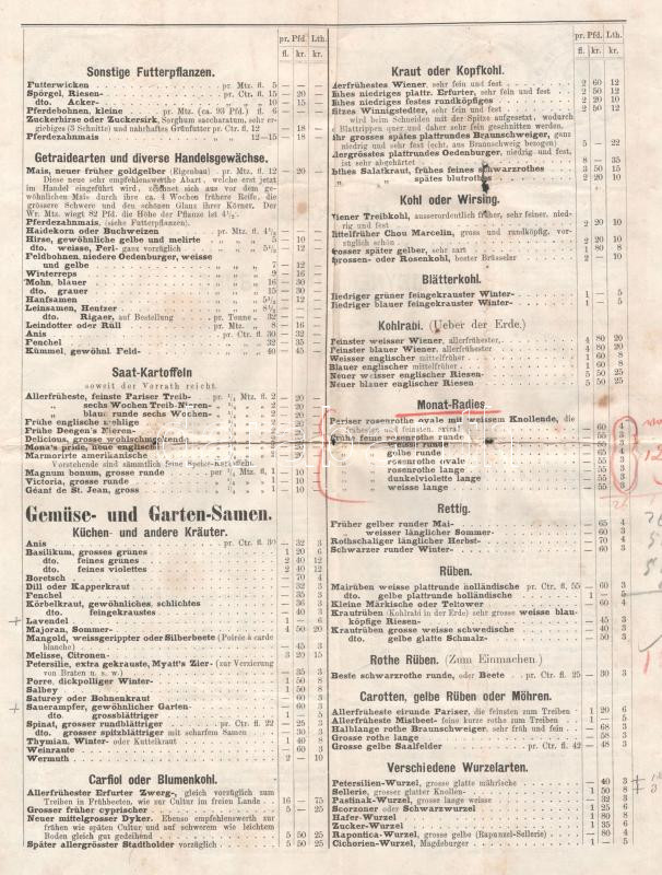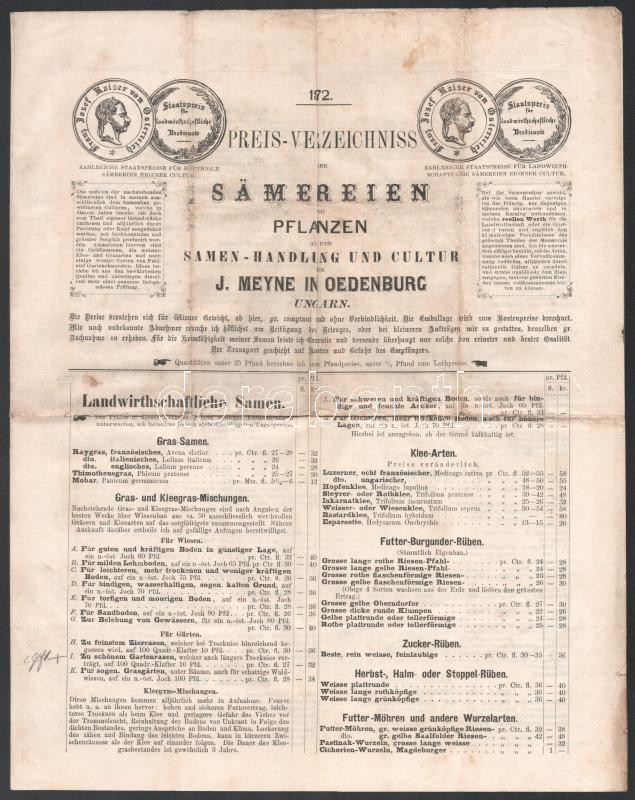 1872 Oedenburg (Sopron), J. Meyne: Preis-Verzeichniss der Sämmereien und Pflanzen aus de Samen-Handlung und Cultur von J. Meyne in Oedenburg, Ungarn. Wien, E. Jesper-ny., foltos, hajtott, bejelölésekkel, 2 sztl. lev. Német nyelvű vetőmag árjegyzék.