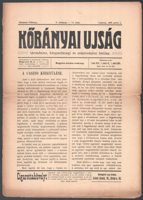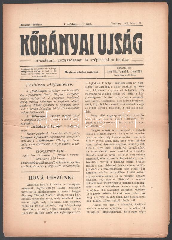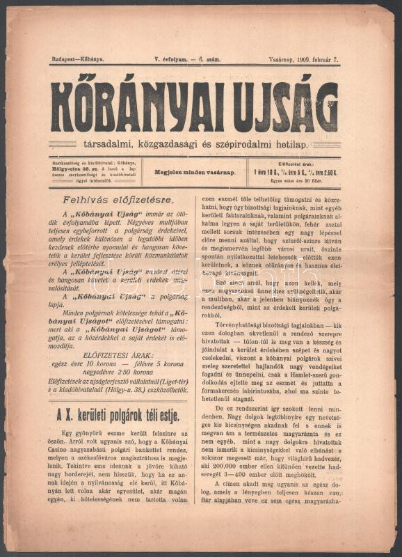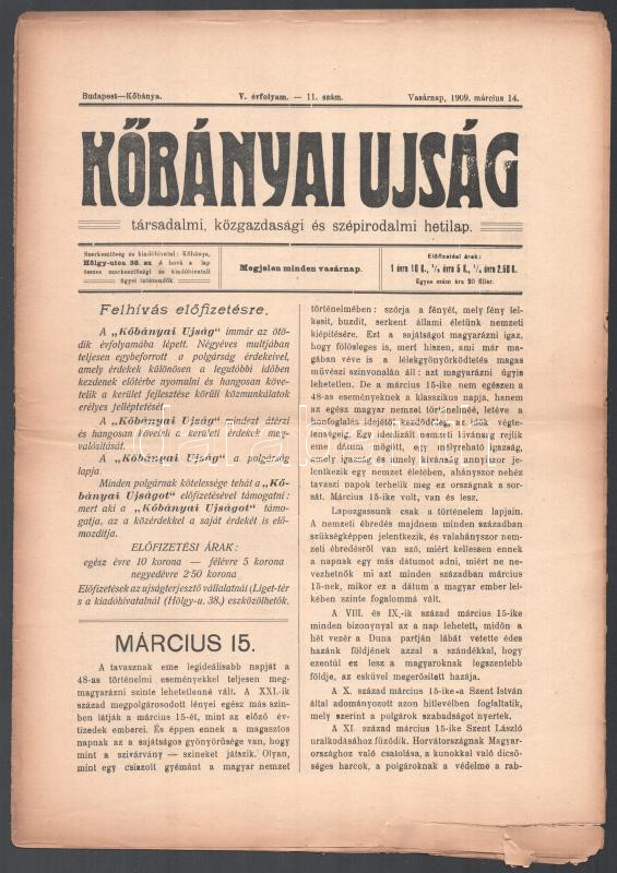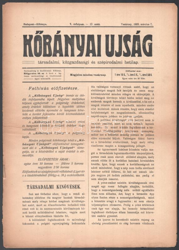 1909 A Kőbányai Újság 11db száma https://www.darabanth.com/hu/471-Gyorsarveres/471.0/Mutargy-papirregiseg-egyeb/Nyomtatvanyok~1000015/1909-A-Kobanyai-Ujsag-11db-szama~II3172970