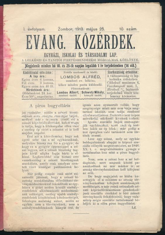 1913 Zombor, az Evang. közérdek c. egyházi, iskolai és társadalmi lap ... https://www.darabanth.com/hu/471-Gyorsarveres/471.0/Mutargy-papirregiseg-egyeb/Nyomtatvanyok~1000015/1913-Zombor-az-Evang-kozerdek-c-egyhazi-iskolai-es-tarsadalmi-lap-I-evf-10-szama~II3173835