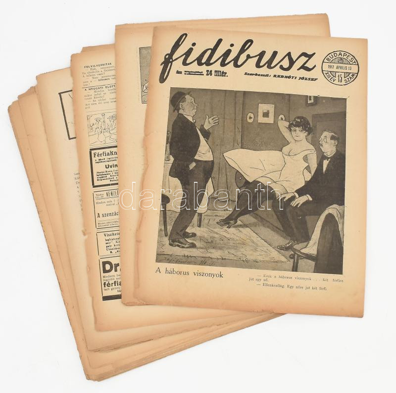 Leírás: 1917 A Fidibusz c. szatirikus folyóirat 7 db száma, nagyrészt jó állapotban