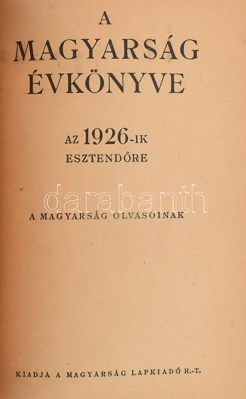 1925-1926 A Magyarság évkönyve az 1925-ik, ill. 1926-ik esztendőre. (Egybekötve). Kiadja a Magyarság Lapkiadó R.T. Bp., Athenaeum-ny., 1 t.+ 362+(6) p.; 303+(1) p. Benne az elszakított Délvidékről, Erdélyről, Felvidékről és Nyugat-Magyarországról (Burgenland) szóló írásokkal. Egészvászon-kötésben.